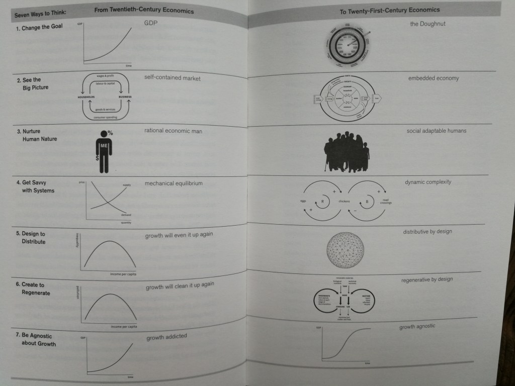 The book gets really interesting in the end, when she talks about regenerative economics and being agnostic about growth. As an avid reader of post-growth and degrowth literature, I was challenged by her idea to invite economic growth back to the negotiation table after we have cleared the hurdle of making socio-ecological well-being our top priority. She argues that growth could be possible and needed in some places, but it would need to respect the priority of keeping within the doughnut and not causing to fall to the empty centre nor to rise above its outer ring. This type of message seems wise, when engaging in dialogues with decision-makers in power at the moment. Any message is easier to communicate when not seeming too fundamental.