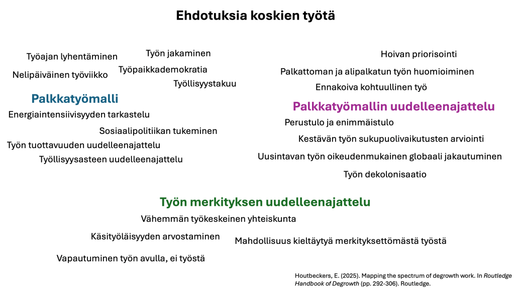 Kohtuutalouden tutkimuksen näkemykset työstä voidaan jakaa ehdotuksiin koskien (i) palkkatyötä, (i) työtä palkkatyötä laajempana sekä (iii) työn uudelleenajateltua (Houtbeckers 2025). Haluan tässä painottaa, että jo palkkatyötä koskevien ehdotusten läpivieminen mullistaisi työpaikkojen, työelämän ja myös talouden dynamiikkoja. Tässä näkyy lista ehdotuksista, esimerkiksi työajan lyhennykset, työn jakaminen ja työpaikkademokratian lisääminen. Millaisia olisivat suomalaiset työpaikat 10 vuoden kuluttua, jos tämän listan uudistukset olisi tehty? Lisäksi kun toiminnassa huomioitaisiin muun muassa feminististen tutkijoiden esittämät havainnot palkattoman ja alipalkatun työn ja hoivatyön merkityksestä yhteiskunnille, olisi työelämässä mahdollista ajaa historiallisia ja kauan kaivattuja uudistuksia.