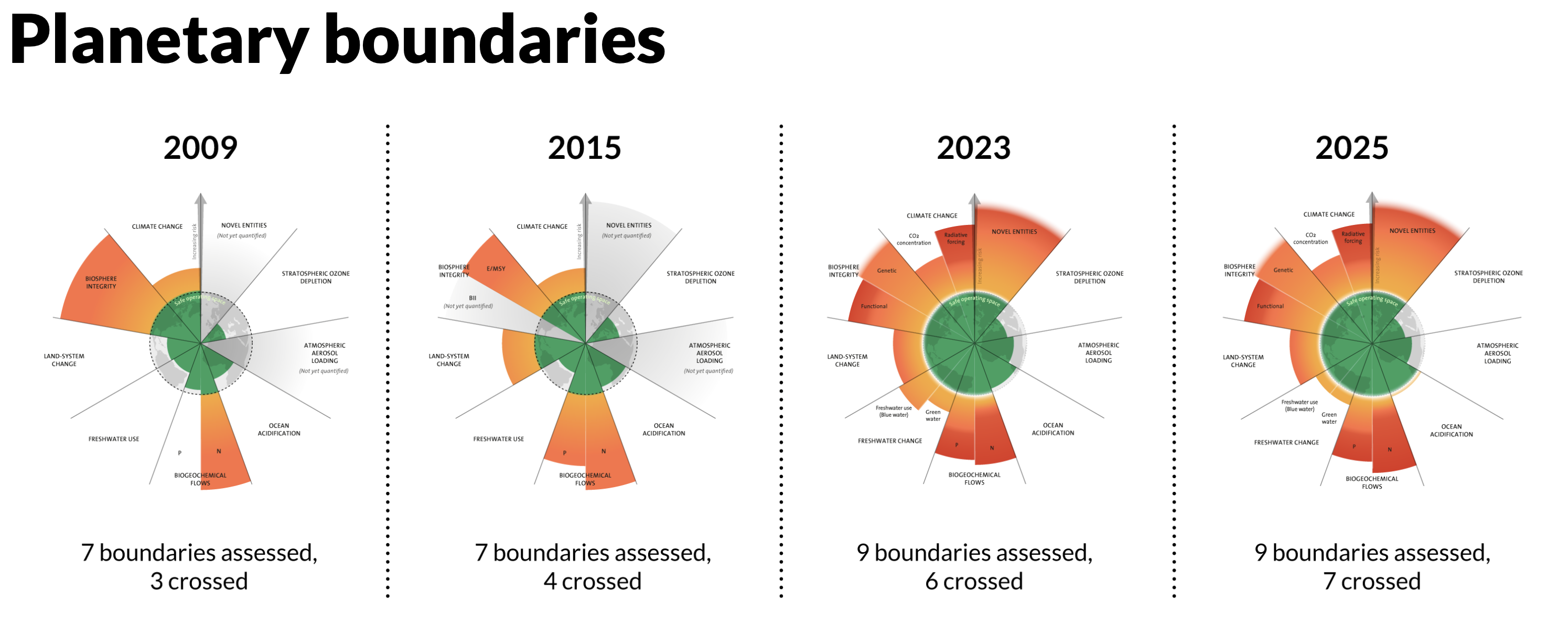 Tukholman reslienssikeskuksessa seurataan planetaarisia rajoja, jotka kuvaavat ihmisyhteisöjen turvallista toimintatilaa. Hiljattain ilmestyneessä artikkelissa todetaan, että seitsemän yhdeksästä planetaarisesta rajasta on ylitetty. Aloitin projektitutkijana vuonna 2009, ja tuolloin kolme näistä mallin rajoista oli ylitetty. Tilanne on siis huonompi.